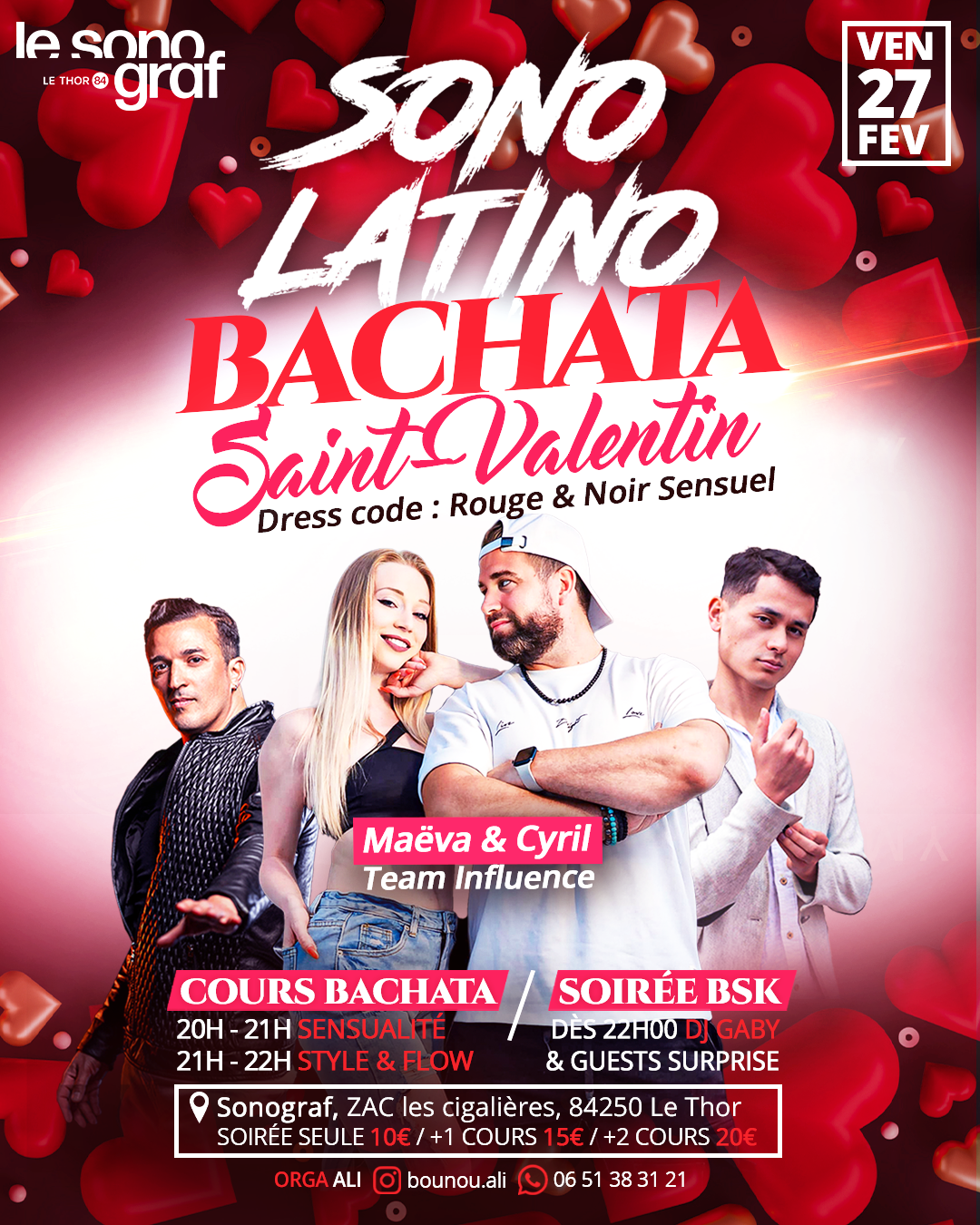 Une soirée placée sous le signe de la connexion, du partage et de la bachata… PROGRAMME 20h – Cours Bachata by Cyril & Maëva (Team Influence) 21h – Cours Bachata by Cyril & Maëva 22h – Soirée sociale by DJ Gaby Guests présents pour votre plaisir tout le week-end Cyril & Maëva seront avec nous : Créneaux de cours particuliers disponibles Réservation en message privé Organisation : Ali TARIFS • Soirée seule : 10€ (dès 22h) • 1 cours + soirée : 15€ (à partir de 21h) • 2 cours + soirée : 20€ Ambiance chaleureuse, danse, connexion… Que tu viennes en couple, entre amis ou solo : on s’occupe du reste À très vite sur la piste